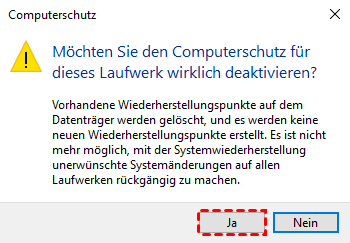 5. Sie erhalten eine Warnung, dass vorhandene Wiederherstellungspunkte gelöscht und keine neuen Wiederherstellungspunkte erstellt werden. Klicken Sie auf Ja, um den Vorgang zu bestätigen.