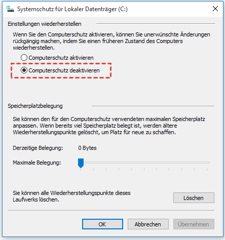 6. Wiederholen Sie Schritt 3 - Schritt 5, wenn es mehr als ein Laufwerk gibt, für das der Systemschutz aktiviert ist.