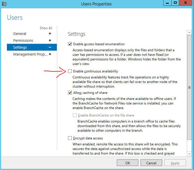 Wenn eine Netzwerkfreigabe die Option "Enable Continuous Availability" hat, können keine Benutzer freigegebene Ordner offline verfügbar machen, sogar manuell machen und die Ordner werden nicht nur auf umgeleitete Ordner beschränkt.