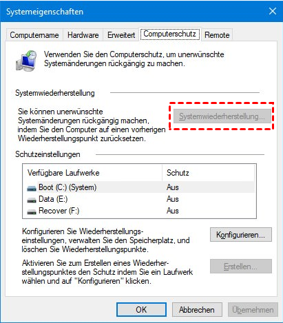 Wenn ie Systemwiederherstellung in Windows 10 ausgegraut oder deaktiviert ist, können Sie sich auf diesen Artikel beziehen und hier nach Lösungen suchen.