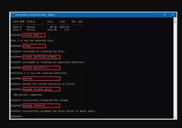 * Denken Sie daran, 1 durch die Nummer des USB-Sticks zu ersetzen und X durch einen beliebigen Buchstaben zu ersetzen, den Sie für Ihren USB-Stick verwenden möchten. Sie sind hier nur ein Beispiel.