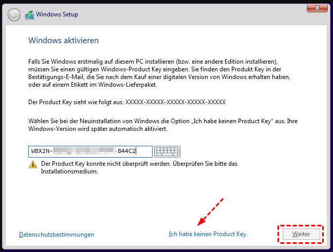 - Wenn Sie Windows 10 zum ersten Mal installieren, müssen Sie einen echten Product Key eingeben. Wenn Sie Windows 10 neu installieren, klicken Sie einfach auf Ich habe keinen Product Key. Klicken Sie dann auf Weiter.