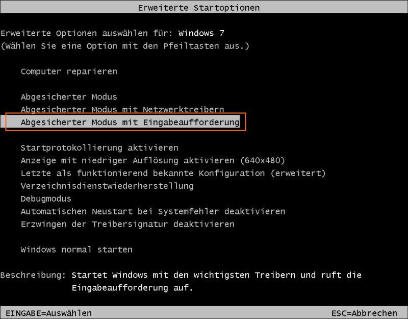 Wählen Sie 6 oder drücken Sie F6, um den „Abgesicherter Modus mit Eingabeaufforderung“ zu aktivieren
