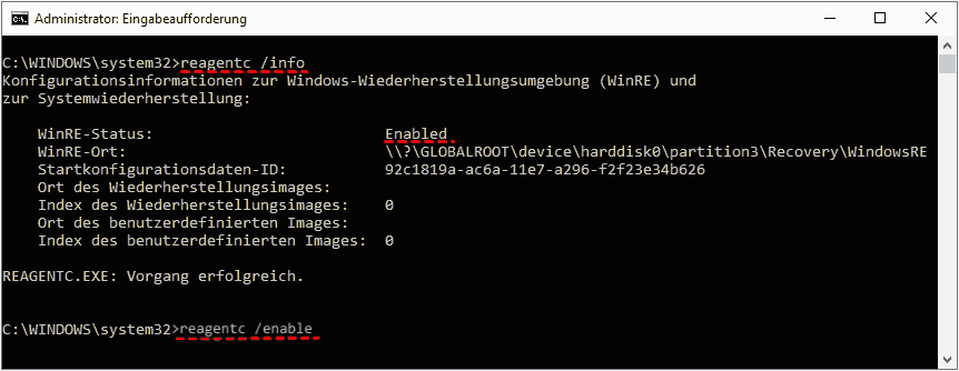 2. (Optional) Überprüfen Sie den Status der Windows 10-Wiederherstellungsumgebung. Geben Sie die Befehlszeile „reagentc /info“ ein und suchen Sie nach dem Status.