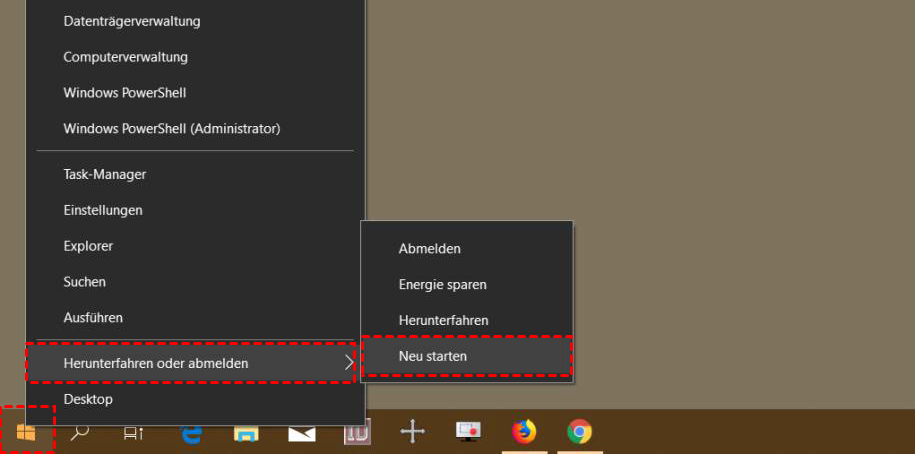 Wählen Sie „Starten“ -> „Herunterladen oder abmelden“ und halten Sie Shift gedrückt, während Sie auf „Neu starten“ klicken.