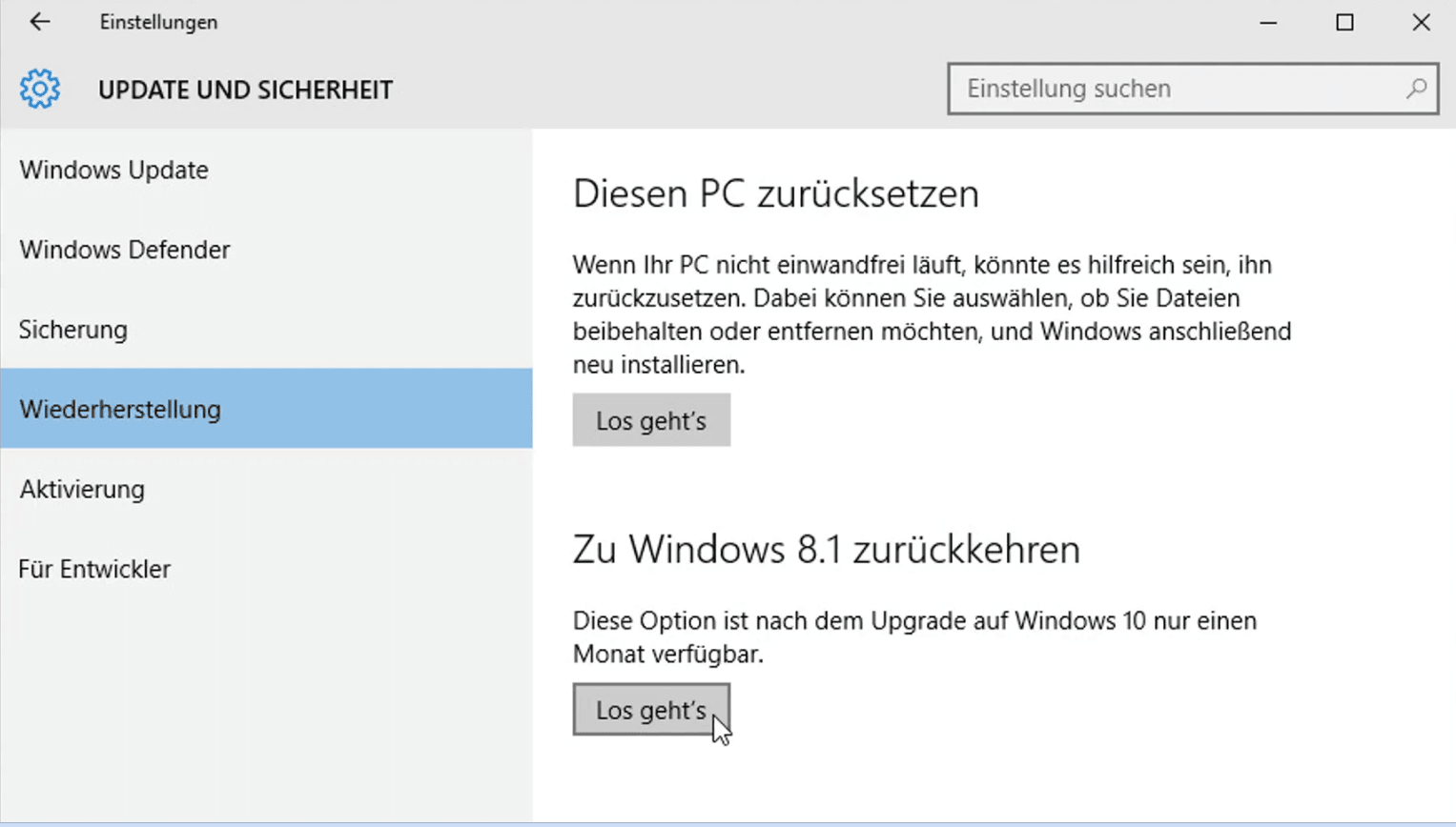 Schritt 2. Dort sehen Sie mehrere Optionen, einschließlich „Diesen PC zurücksetzen“, „Zu Windows 8.1 zurückkehren“ (abhängig von der vorherigen Version Ihres Windows) und andere Optionen. Scrollen Sie zum Abschnitt Zu Windows 8.1 zurückkehren und klicken Sie auf Los geht's.