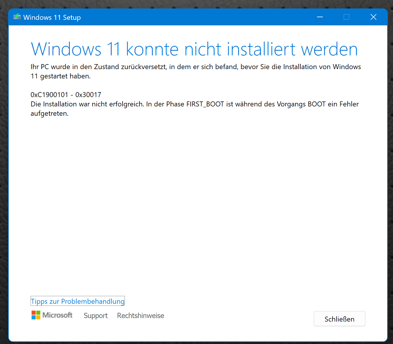 Ich versuche das neue Windows 11-Update über Windows Update zu installieren, erhalte jedoch immer den Fehler 0xC1900101. Die Installation startet, und nach einigen Neustarts erscheint die Meldung: