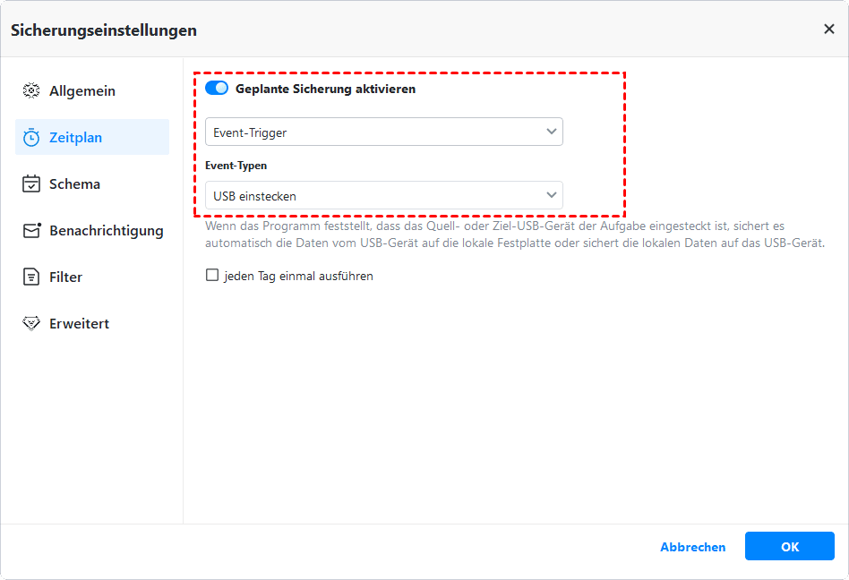 AOMEI Backupper sichert NUR die ausgewählten Dateien, die sich derzeit auf einem USB-Laufwerk befinden. Wenn Sie Änderungen vornehmen, werden diese nicht berücksichtigt, es sei denn, Sie sichern sie regelmäßig. Zeitplan bietet in dieser Software immer noch die einfachste und Plug-and-Pull-Methode USB einstecken, um Dateien automatisch zu sicheren, wenn USB angeschlossen ist.