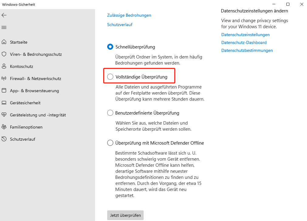 3. Klicken Sie anschließend auf Scanoptionen, um alle verfügbaren Scans anzuzeigen. Wählen Sie die Option Vollständige Überprüfung aus und klicken Sie unten auf die Schaltfläche Jetzt überprüfen, um Ihren PC tiefgehend auf Viren oder Malware zu überprüfen.