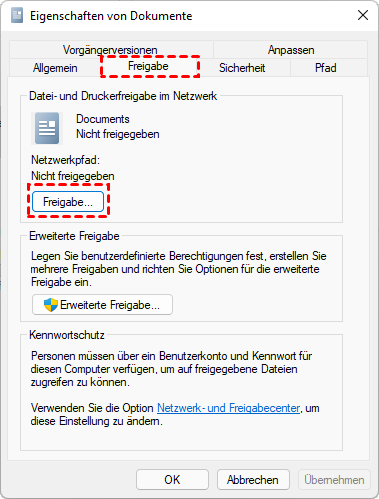 Schritt 4. Klicken Sie auf die Schaltfläche Freigabe... unter dem Tab „Freigabe“.