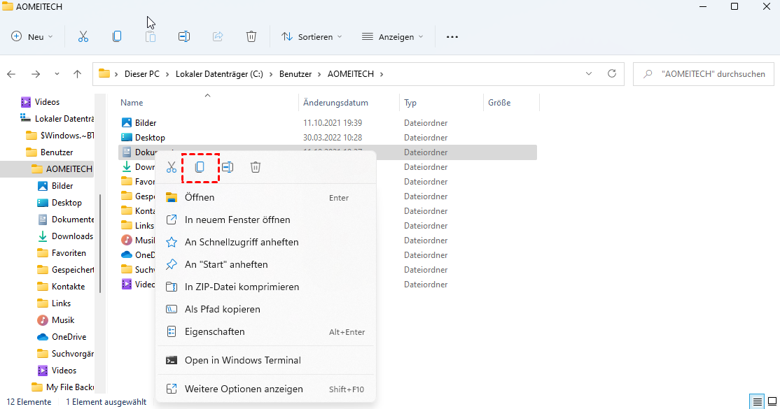 Schritt 2. Klicken Sie mit der rechten Maustaste auf den Ordner Dokumente und klicken Sie auf Kopieren.