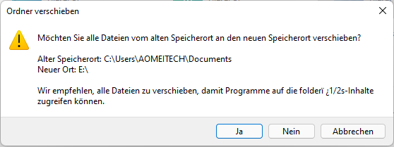 Schritt 5. Klicken Sie auf „Ja“, wenn Sie gefragt werden: „Möchten Sie alle Dateien vom alten Ort an den neuen Speicherort verschieben?“. Warten Sie dann einige Minuten (die Zeit hängt von der Größe des Ordners ab).