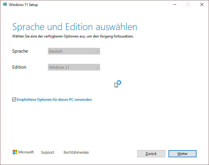 5. Das Setup-Programm wählt automatisch die Sprache, Version und Architektur von Windows 11 basierend auf Ihrer aktuellen Windows-Umgebung aus. Wenn Sie die Standardeinstellungen ändern möchten, deaktivieren Sie das Kontrollkästchen Empfohlene Optionen für diesen Computer verwenden und wählen Sie danach aus den verfügbaren Optionen aus.