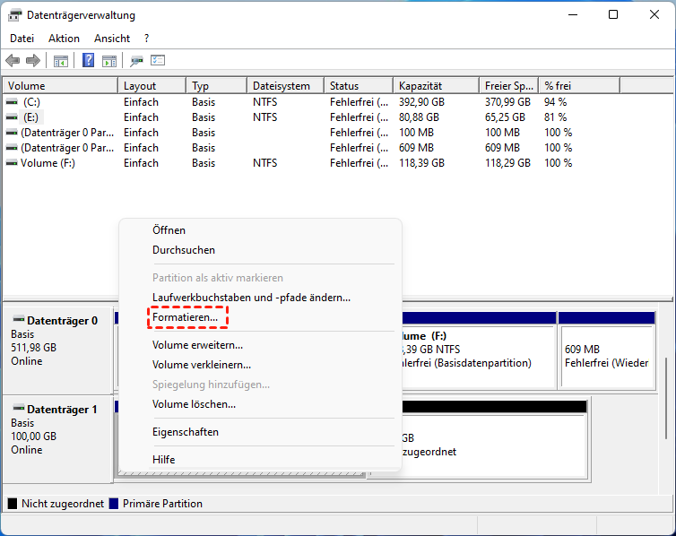 Schritt 3. Klicken Sie mit der rechten Maustaste auf den Datenträger, den Sie löschen möchten, und klicken Sie auf Formatieren.
