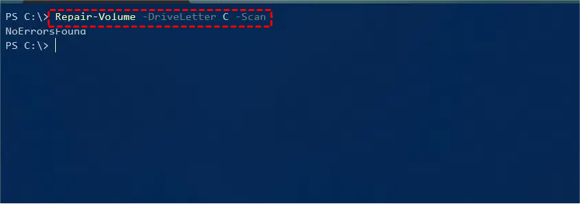 Schritt 3. Geben Sie Repair-Volume -DriveLetter C -SpotFix ein und drücken Sie die Eingabetaste, um Festplattenfehler zu reparieren (falls vorhanden).