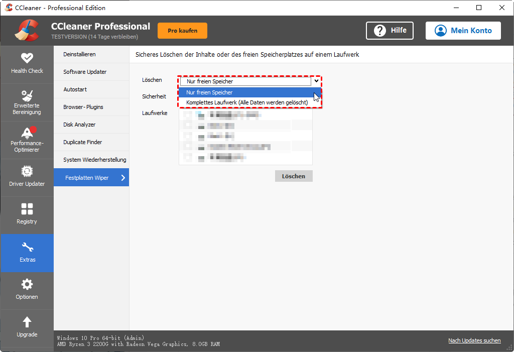 1. Sobald Sie CCleaner heruntergeladen und installiert haben, öffnen Sie das Programm und wählen Sie Extras > Festplatten Wiper. Wählen Sie den gewünschten Löschtyp aus: Nur freien Speicher und Komplettes Laufwerk (Alle Daten werden gelöscht).