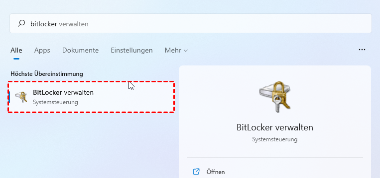 Schritt 1. Geben Sie BitLocker verwalten in das Suchfeld ein und klicken Sie dann auf Öffnen.