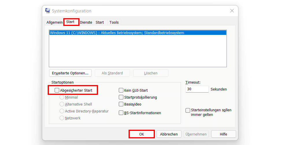 2. Deaktivieren Sie auf der Registerkarte Start die Option Abgesicherter Start, klicken Sie auf Übernehmen und OK, um die Änderungen zu speichern und Ihren PC normal neu zu starten.