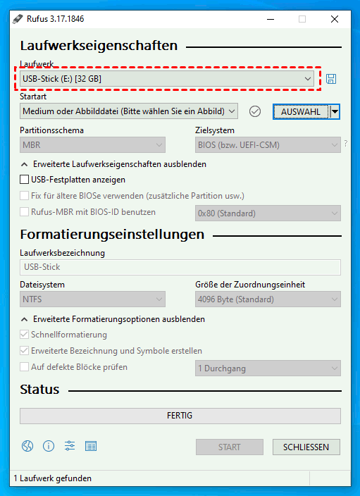 - Vergewissern Sie sich, dass Sie das richtige Laufwerk ausgewählt haben und klicken Sie auf Start, um mit Rufus ein Portable Windows 11 auf einem USB-Laufwerk zu erstellen.