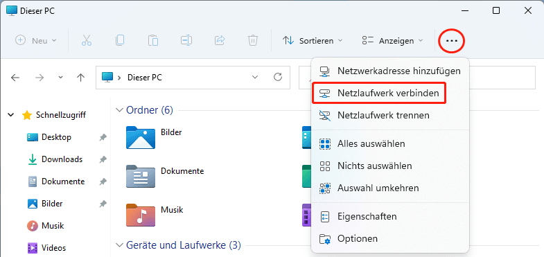 Schritt 2. Wählen Sie diesen PC im linken Bereich aus. Wählen Sie dann in der Multifunktionsleiste des Datei-Explorers ••• > Netzlaufwerk verbinden.