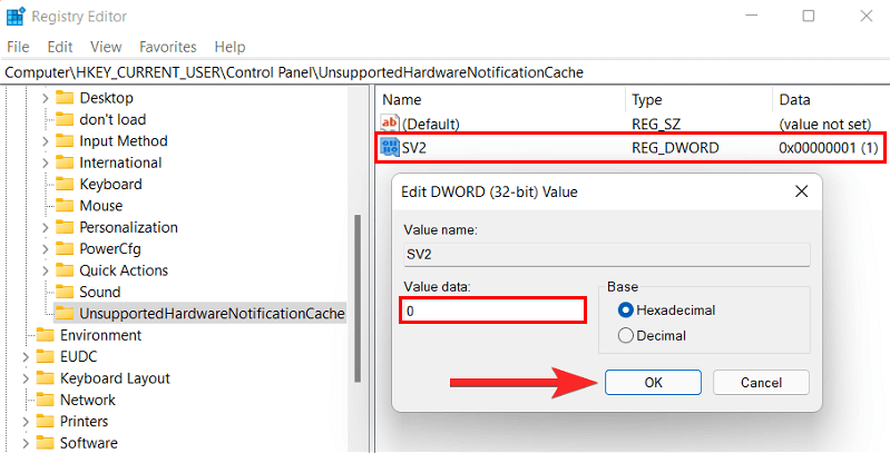 - Doppelklicken Sie im Ordner „UnsupportedHardwareNotificationCache“ auf SV2 und ändern Sie Wert von 1 auf 0. Klicken Sie auf OK, um die Änderungen zu übernehmen.