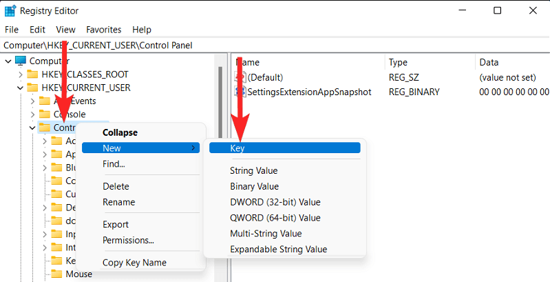 - Navigieren Sie zu dem in Schritt 2 oben angegebenen Pfad, klicken Sie mit der rechten Maustaste auf Control Panel auf der linken Seite und wählen Sie Neu -> Schlüssel.