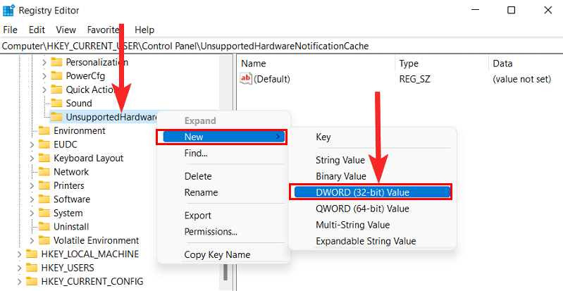 - Klicken Sie dann mit der rechten Maustaste auf den Ordner UnsupportedHardwareNotificationCache und wählen Sie Neu -> DWORD (32-bit) Wert.