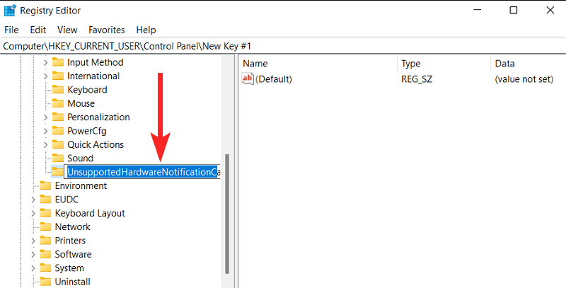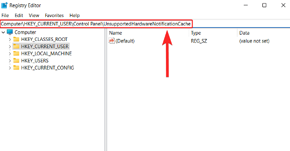 - Computer\HKEY_CURRENT_USER\Control Panel\UnsupportedHardwareNotificationCache