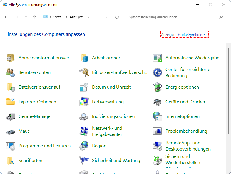 Alternativ können Sie auch direkt nach ihnen suchen. Außerdem können Sie ihnen finden, indem Sie die Systemsteuerung öffnen und Große Symbole/Kleine Symbole in der oberen rechten Ecke der Systemsteuerung auswählen, wo sich „Anzeige“ befindet.
