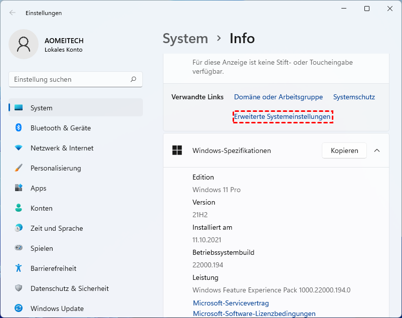 2. Klicken Sie auf System > Erweiterte Systemeinstellungen.