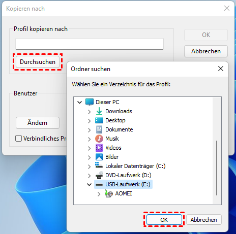 5. Klicken Sie auf Durchsuchen, um das Windows 11-Benutzerprofil auf der externen Festplatte zu speichern, die Sie angeschlossen haben, und klicken Sie auf OK.