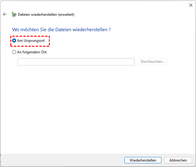 5. Wählen Sie Am Ursprungsort und klicken Sie auf Wiederherstellen.