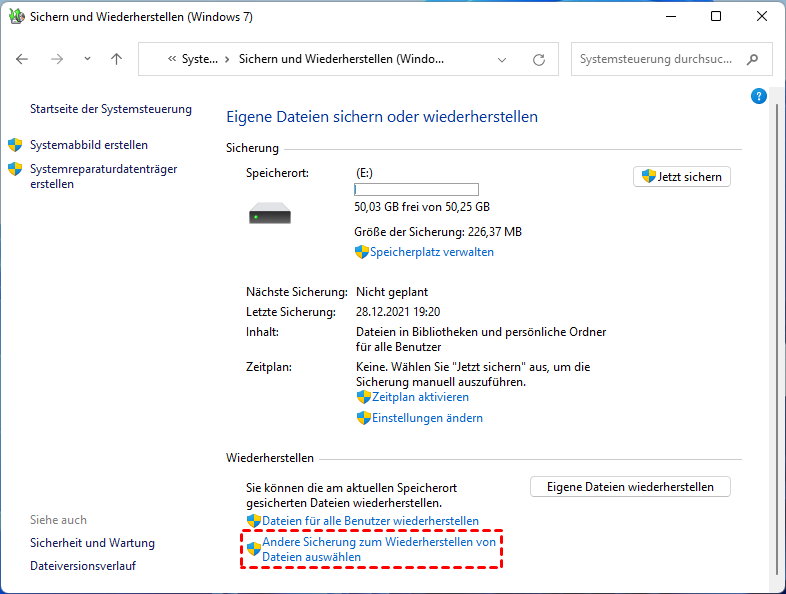 Zunächst können Sie das Benutzerprofil in Windows 11 mithilfe von Sichern und Wiederherstellen (Windows 7) sichern. Es wird empfohlen, eine Sicherung auf einer externen Festplatte, einem Netzlaufwerk oder einem anderen externen Speicherort vorzunehmen.