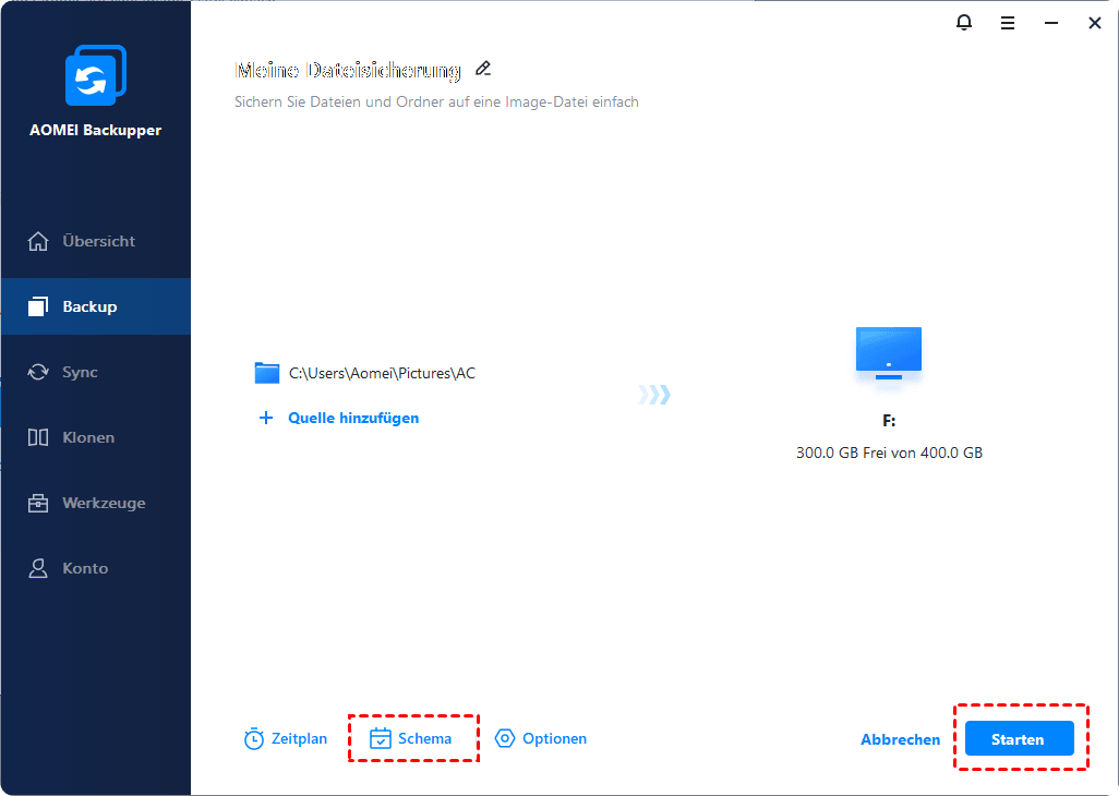 - Backup-Schema: Sie können verschiedene Sicherungsmethoden (Voll-/Inkrementelles/Differentielles Backup) wählen und die automatische Backup-Bereinigung aktivieren, um Ihren Festplattenspeicher zu sparen.