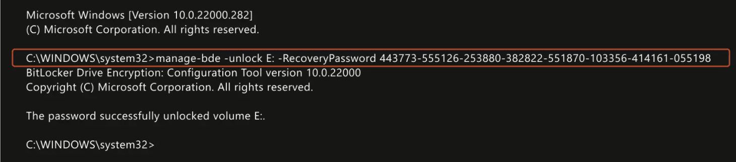 ✍️Hinweis: Ersetzen Sie den Laufwerksnamen durch den Laufwerksbuchstaben des mit BitLocker verschlüsselten Laufwerks und den Wiederherstellungscode durch den tatsächlichen Wiederherstellungsschlüssel, der beim Verschlüsseln des Laufwerks zugeteilt wurde.