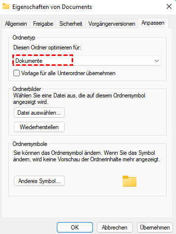 Schritt 2. Gehen Sie zum Abschnitt Anpassen und wählen Sie Dokumente aus dem Menü Diesen Ordner optimieren für.
