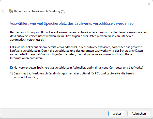 Schritt 5. Wählen Sie als Nächstes aus, wie viel Speicherplatz des Laufwerks verschlüsselt werden soll. Wählen Sie Gesamtes Laufwerk verschlüsseln, um sicherzustellen, dass alle Daten geschützt sind,