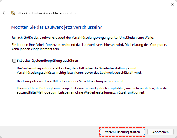 Schritt 7. Klicken Sie auf Verschlüsselung starten, damit BitLocker die externe Festplatte in Windows 11 verschlüsseln kann.