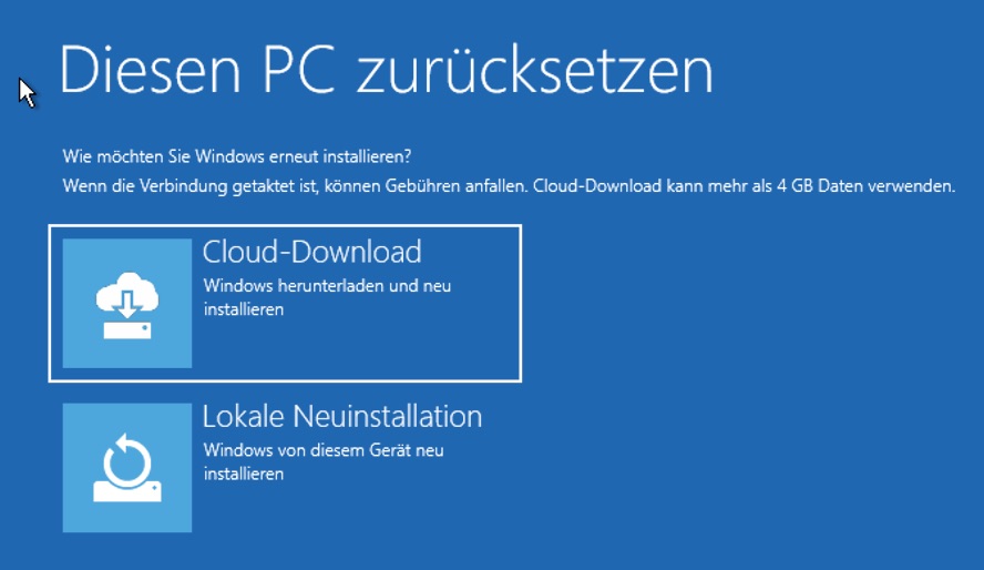 4. Dann möchte Windows 11 wissen, ob Sie die Neuinstallation mit der Cloud-Download oder der lokalen Neuinstallation durchführen möchten. Wählen Sie die gewünschte Methode aus, indem Sie sie anklicken.