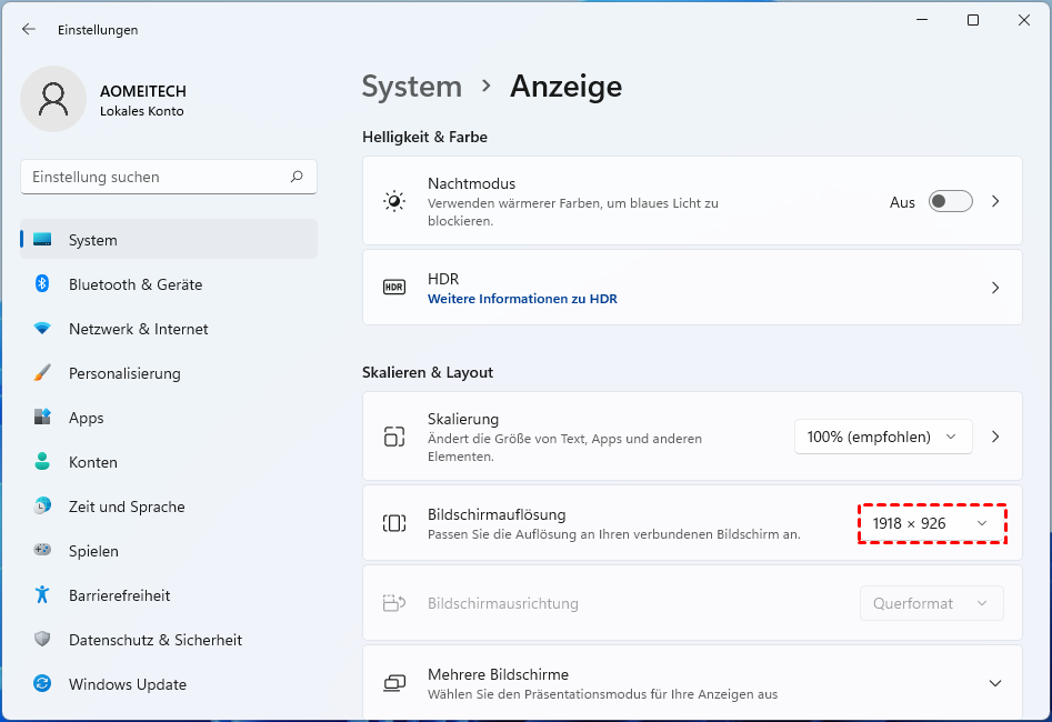 Wenn Ihr Computerbildschirm keine höheren Auflösungen unterstützt, besteht eine hohe Wahrscheinlichkeit, dass Windows 11 immer wieder einfriert. Dies liegt daran, dass die höhere Auflösung die GPU dazu veranlasst, auf dem Bildschirm zu verarbeiten, aber wenn das System eine niedrigere GPU hat, wird es das System einfrieren. Sie können die Auflösung des Bildschirms ändern, indem Sie die folgenden Schritte ausführen.