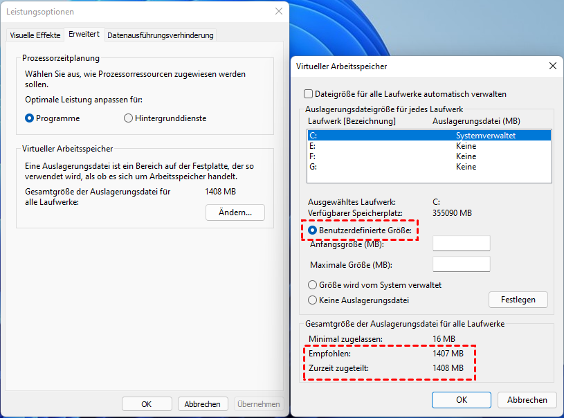 Unzureichender Arbeitsspeicher kann auch dazu führen, dass Windows 11 ständig abstürzt und sogar BSOD (Black Screen of Death) verursacht. Sie können also den für den RAM-Überlauf reservierten Speicherplatz vergrößern, indem Sie virtuellen Speicher hinzufügen, um das Problem mit dem Einfrieren des Windows 11-Bildschirms zu lösen.