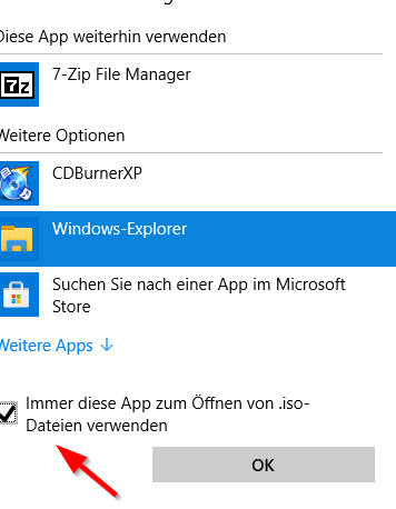 Schritt 3. Wählen Sie den Windows Explorer aus der Liste. Aktivieren Sie die Option Immer diese Anwendung zum Öffnen von ISO-Dateien verwenden und klicken Sie auf OK.