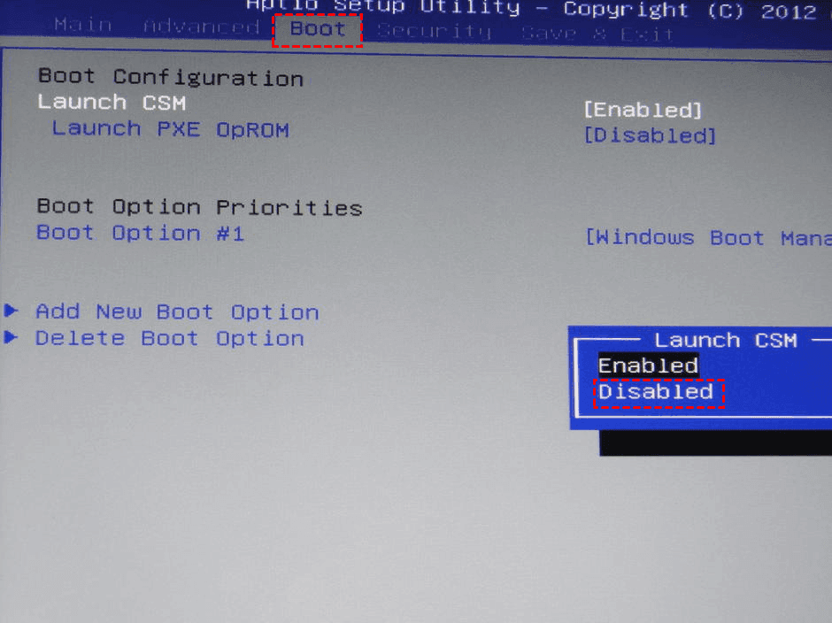 2. Suchen Sie die Option „Launch CSM“ unten auf der Registerkarte „Boot“ und setzen Sie sie auf „Disabled“.