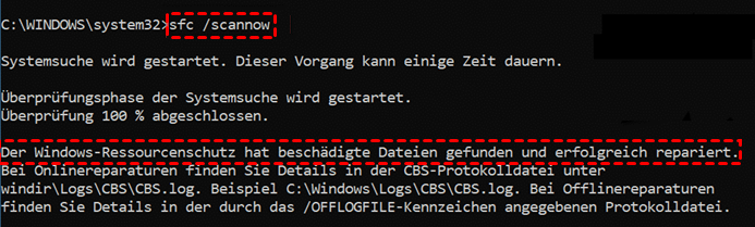 Schritt 2. Geben Sie sfc /scannow ein und drücken Sie zum Ausführen die Eingabetaste. Dieser Vorgang kann 20 Minuten dauern, um die beschädigten Systemdateien zu scannen oder zu reparieren. Bitte warten Sie geduldig und starten Sie dann Ihren Computer neu, damit die Änderungen wirksam werden.