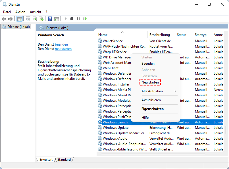 2. Scrollen Sie nach unten, um Windows Search zu finden. Klicken Sie mit der rechten Maustaste darauf, um es neu zu starten.