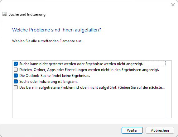 4. Sie sehen das Popup-Fenster „Suche und Indizierung“ aufgrund eines Problems „Die Suchleiste wird nicht angezeigt“. Klicken Sie auf alle zutreffenden Optionen, insbesondere „Suche kann nicht gestartet werden oder Ergebnisse werden nicht angezeigt“.