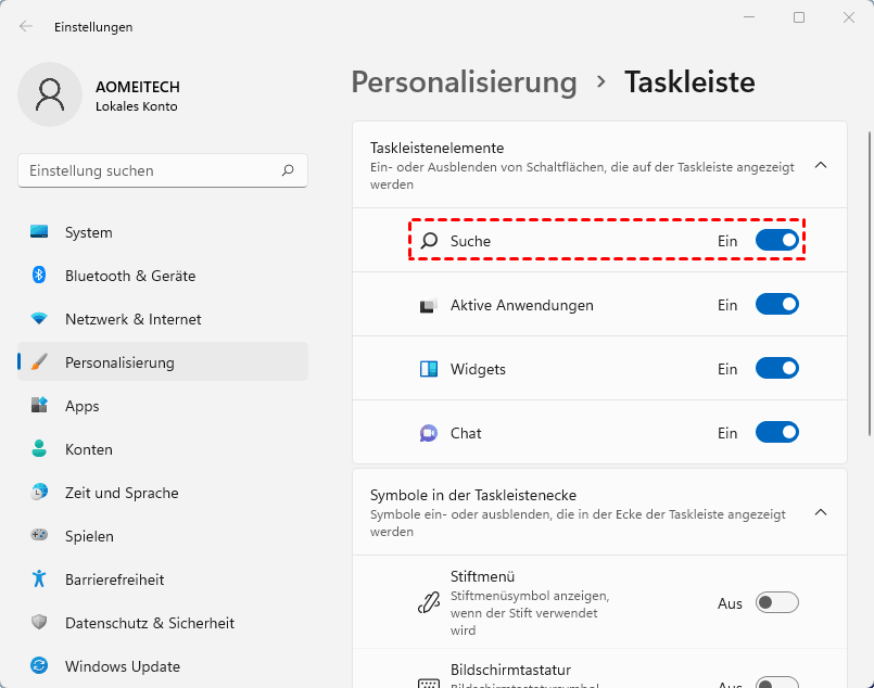 2. Dann wird das Fenster Einstellungen geöffnet. Wenn die Option Suche unter dem Taskleistenelement nach dem Windows 11-Update deaktiviert ist, aktivieren Sie es bitte.