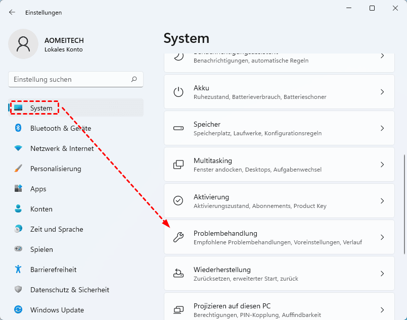 1. Drücken Sie Windows + I, um die Einstellungen zu öffnen. Gehen Sie zu System > Problembehandlung.