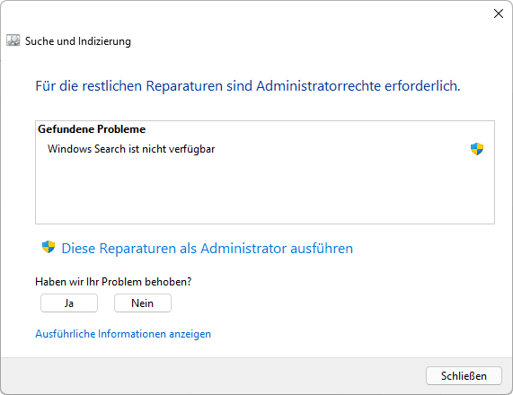 Es kann hilfreich sein, das Problem im Detail zu beschreiben. Als Nächstes wird die Problembehandlung feststellen, dass die Windows Search nicht verfügbar ist. Sie müssen das Problem als Administrator reparieren. Klicken Sie, um fortzufahren.