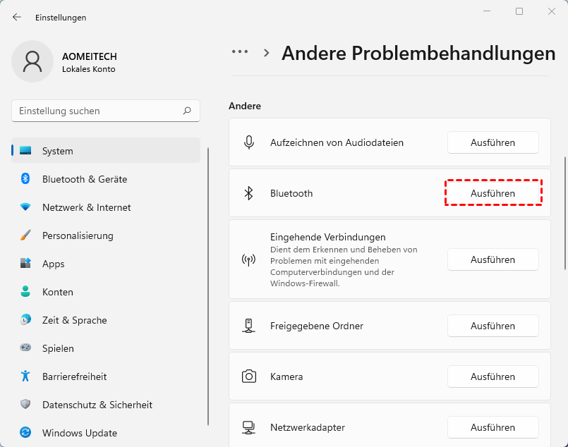 3. Suchen Sie die betreffende Problembehandlung für Ihr aktuelles Problem und klicken Sie auf Ausführen. Die Problembehandlung erkennt dann Probleme mit der von Ihnen ausgewählten Komponente/Funktion und behebt alle gefundenen Probleme.